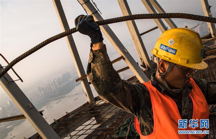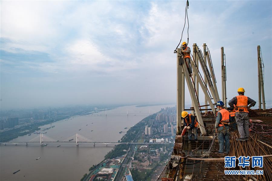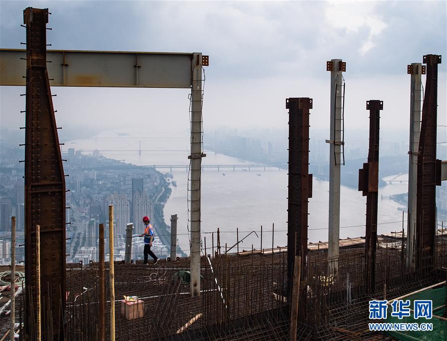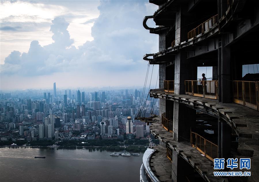 8月11日,工人在武漢綠地中心項目建設現(xiàn)場近500米的高空施工。新華社記者肖藝九攝
