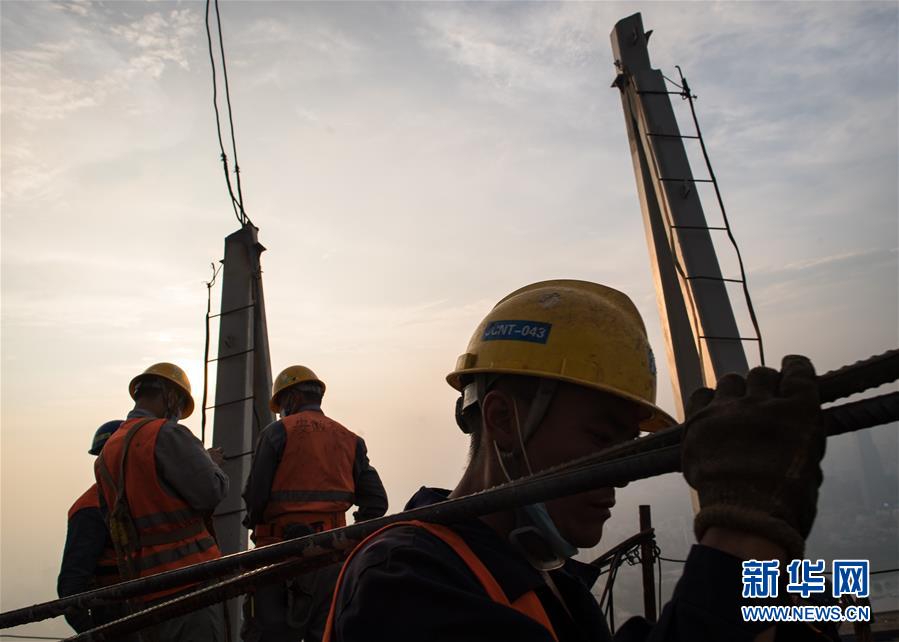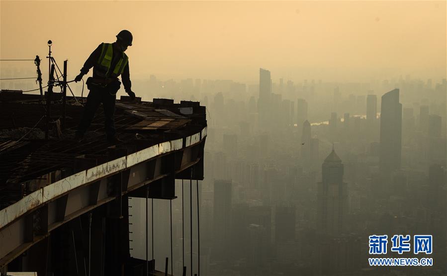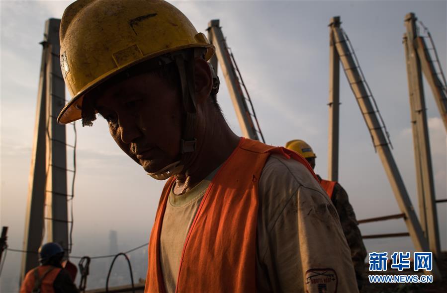 8月11日傍晚,工人在武漢綠地中心項目建設現(xiàn)場近500米的高空施工。新華社記者肖藝九攝