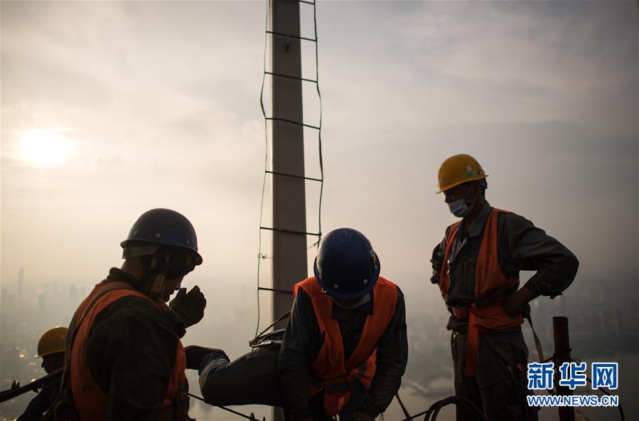 8月11日,工人在武漢綠地中心項(xiàng)目建設(shè)現(xiàn)場(chǎng)近500米的高空施工。新華社記者肖藝九攝