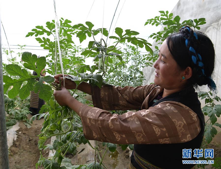 合作社成員拉姆在大棚內(nèi)修剪瓜秧(8月2日攝)。新華社記者 李賀 攝