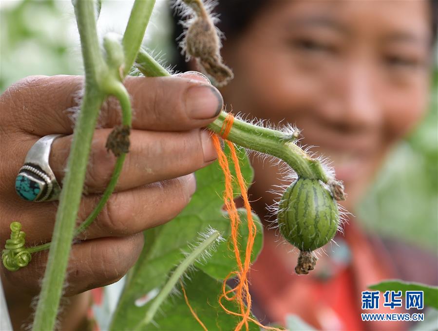 格桑旺姆姐妹家大棚內(nèi)的瓜秧上結(jié)出的小西瓜(8月2日攝)。新華社記者 李賀 攝