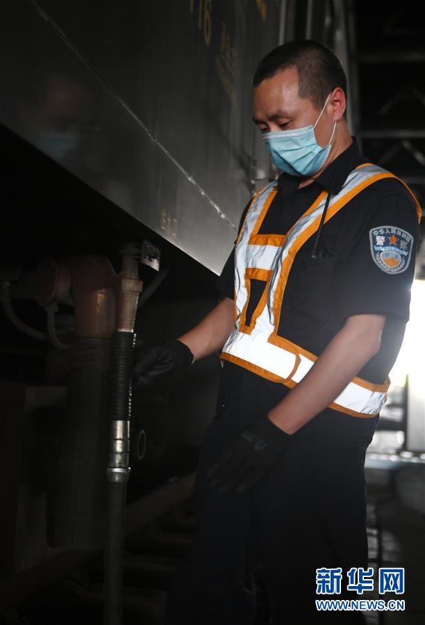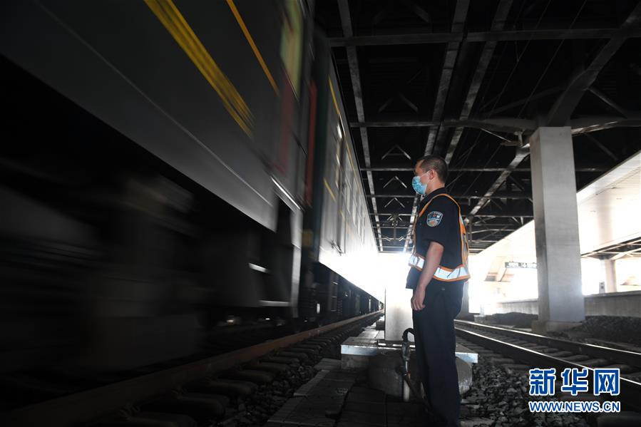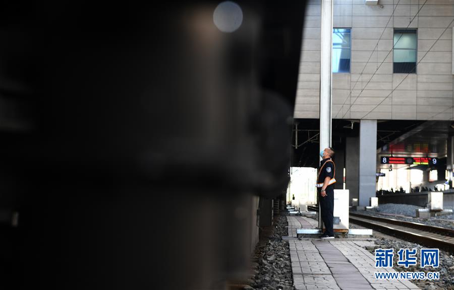 8月12日,長(zhǎng)春火車站客運(yùn)車間上水工韓冰等候列車停站。新華社記者 林宏 攝