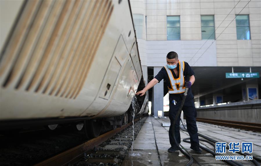 8月12日,長(zhǎng)春火車站客運(yùn)車間上水工韓冰在給列車上水。新華社記者 林宏 攝