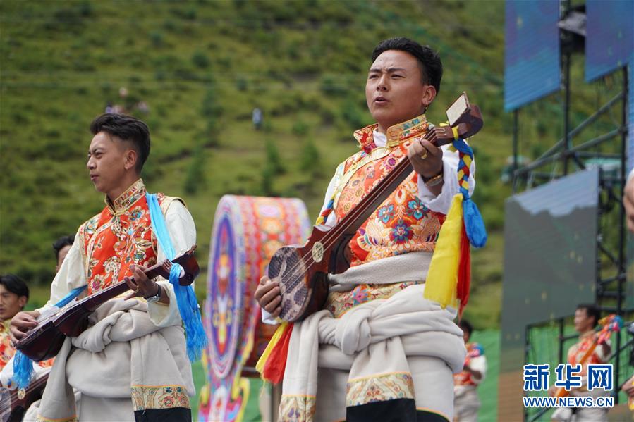 8月12日,演員在開(kāi)幕式上表演舞蹈。當(dāng)日,2020中國(guó)碌曲鍋莊舞展演暨甘南藏族自治州第六屆少數(shù)民族傳統(tǒng)體育運(yùn)動(dòng)會(huì)在甘肅省甘南州碌曲縣夏澤灘草原上舉行。開(kāi)幕式上,三千余名身著節(jié)日盛裝的演員和當(dāng)?shù)厝罕娫诓菰掀鹞?,雨后初晴的草原上充滿歡聲笑語(yǔ)。新華社記者 耿馨寧 攝
