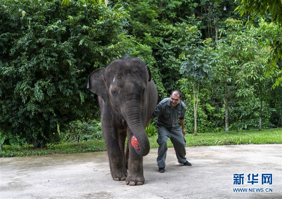 8月12日,在西雙版納傣族自治州亞洲象種源繁育及救助中心,救助象“羊妞”在生日會上與一名“象爸爸”玩皮球。