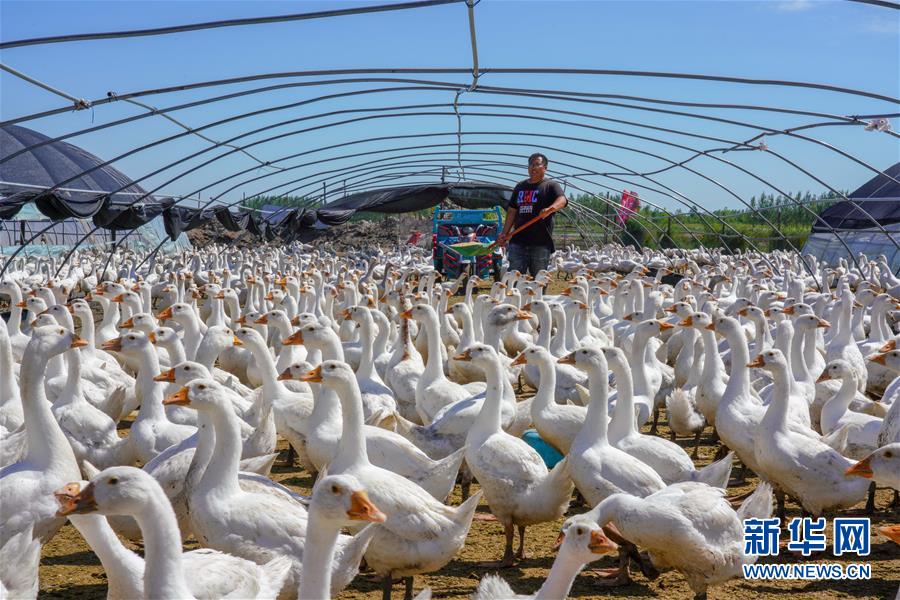 8月12日,在鎮(zhèn)賚縣黑魚泡鎮(zhèn)岔臺(tái)村,村民王木堯在投喂鵝飼料。