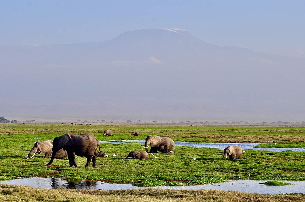 肯尼亞東南部,與坦桑尼亞接壤的安博賽利國家公園,距內(nèi)羅畢240公里,因水草豐美而成為野生非洲大象的樂園。
