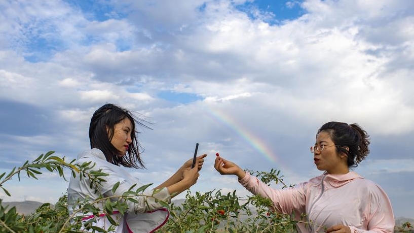 7月13日,在新疆精河縣托里鎮(zhèn)的一處枸杞種植園,村民在采收枸杞。