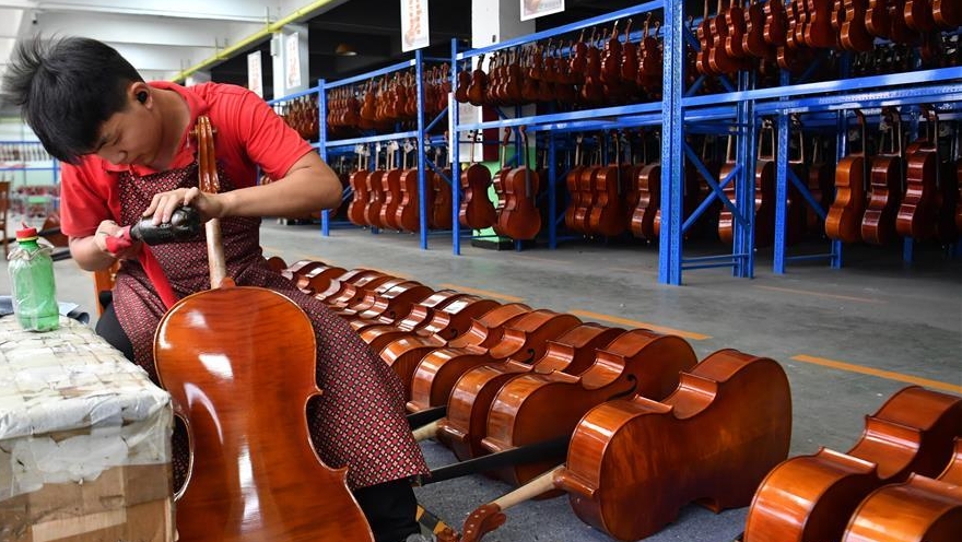 工人在河南駐馬店市確山縣提琴產業(yè)園提琴生產車間打磨琴頭。