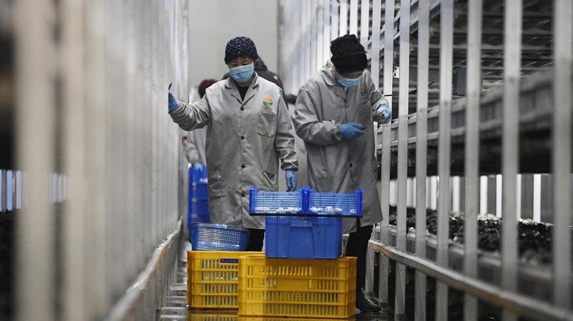 2020年3月18日,在寧夏銀川市永寧縣閩寧鎮(zhèn)雙孢菇栽培示范基地,農(nóng)民在采摘蘑菇。