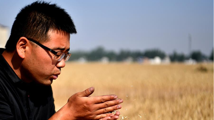 在河南省鄲城縣東風(fēng)鄉(xiāng)前于洼村,王連杰在觀察麥粒。