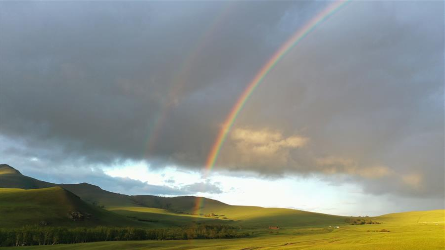 這是6月3日拍攝的阿魯科爾沁草原上的彩虹(無人機(jī)照片)。
