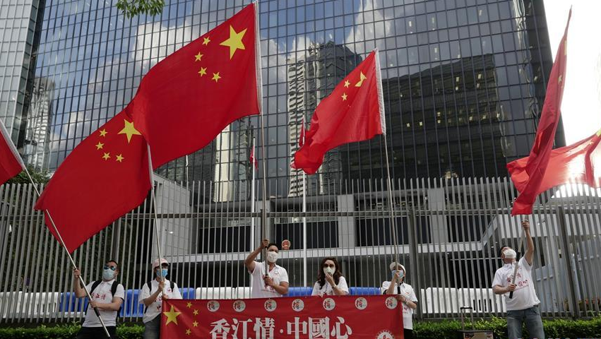 6月4日,在香港金鐘,香港市民慶祝香港特區(qū)立法會三讀通過《國歌條例草案》。