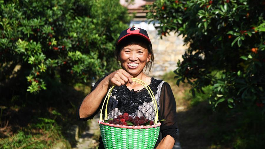 6月4日,工作人員在燕山鄉(xiāng)泉水村楊梅基地展示剛采摘下來的楊梅。
