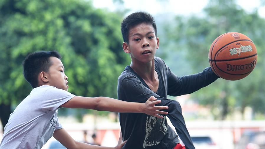 圖為6月4日,張家城在體育課上練習(xí)上籃(無人機(jī)照片)。
