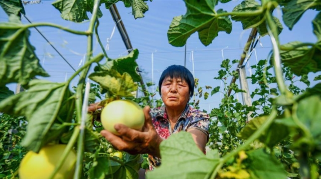 5月20日,新河縣尋寨鎮(zhèn)桃園村村民在采摘甜瓜。