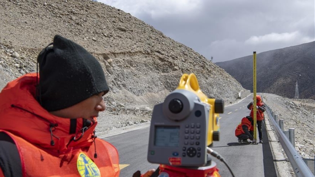 近日,國測一大隊(duì)隊(duì)員在日喀則市定日縣曲當(dāng)鄉(xiāng)境內(nèi)進(jìn)行水準(zhǔn)測量。