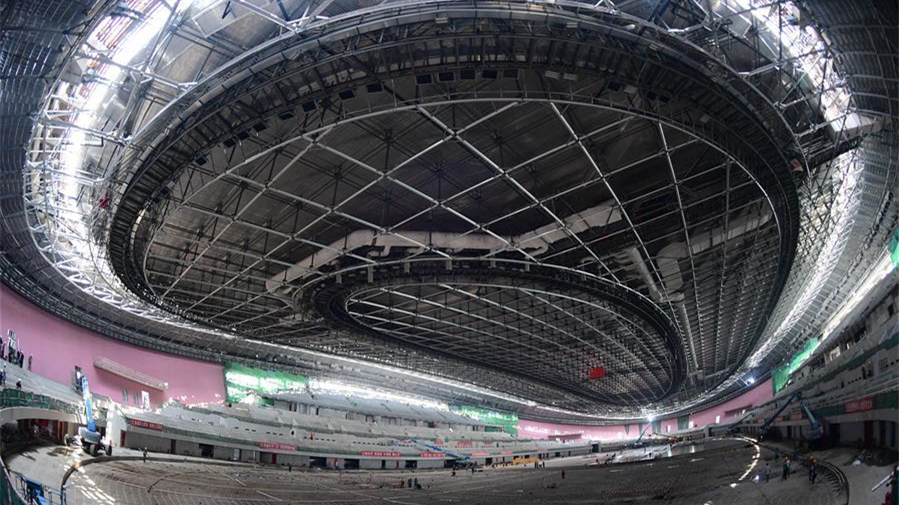 7月22日,工人在國(guó)家速滑館內(nèi)施工。