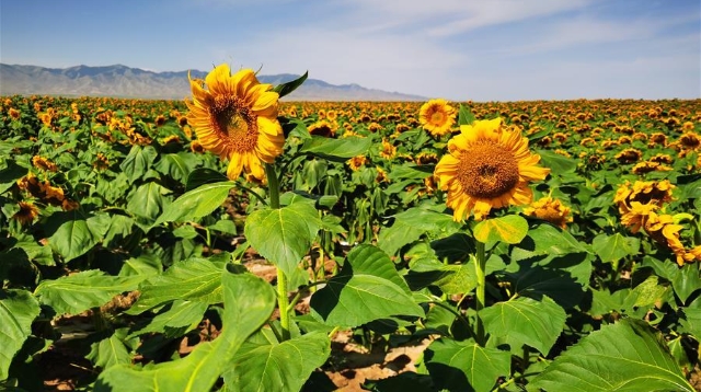 初秋時(shí)節(jié),位于甘肅省白銀市景泰縣寺灘鄉(xiāng)的十萬畝向日葵競相綻放,金黃的葵花張開“笑臉”,迎接豐收。