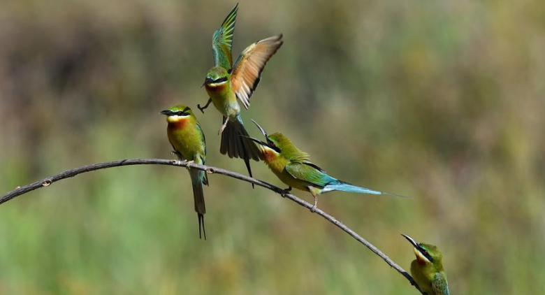 近日,百余只栗喉蜂虎和少量藍(lán)喉蜂虎來到海南省海口市西海岸多個地點棲息繁衍,為椰城增添一抹亮色。