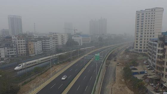 當(dāng)日,廣西南寧市遭遇大霧鎖城。彌漫的大霧讓遠(yuǎn)處的建筑物若隱若現(xiàn),也讓不少出行的市民戴上了口罩。