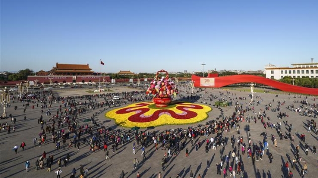10月14日,以“花果籃”為主造型的天安門廣場(chǎng)中心花壇吸引了眾多游客參觀拍照?!盎ü@”的夜景更是流光溢彩,絢爛迷人。