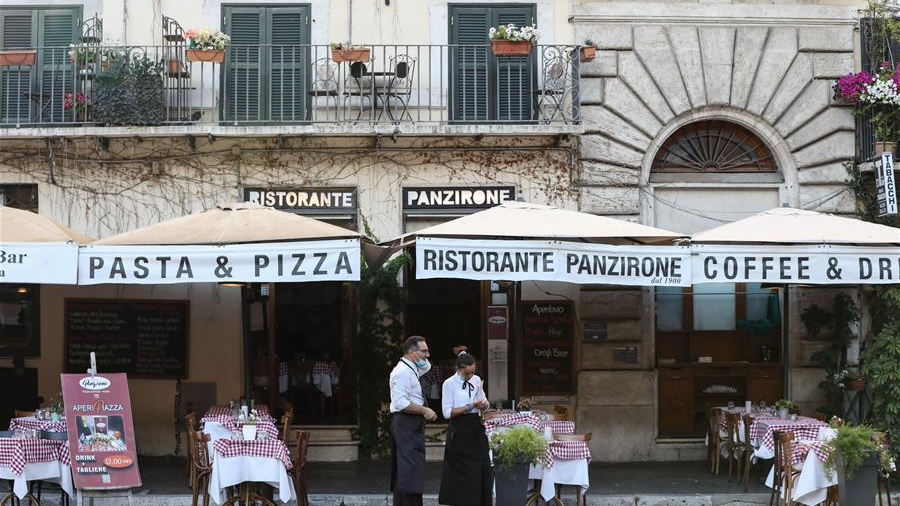 8月4日,人們在意大利首都羅馬一家餐廳用餐。受新冠疫情影響,今年夏天羅馬的歷史中心區(qū)游客比往年明顯減少。