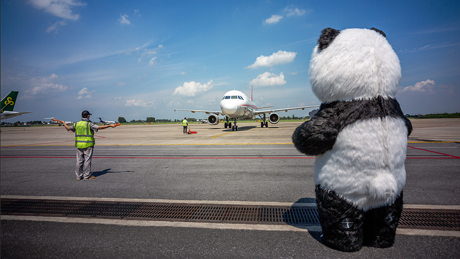 2020年8月5日,江蘇揚州,工作人員在揚州泰州國際機場將大熊貓搬運出機艙。