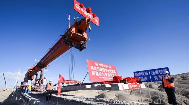 中鐵一局的施工人員在格庫(kù)鐵路新疆段鋪設(shè)最后一組軌排。