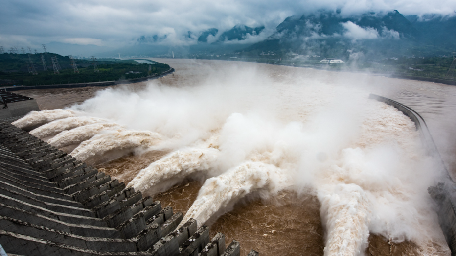 2020年7月25日,湖北宜昌,三峽樞紐開(kāi)啟泄洪深孔泄洪。
