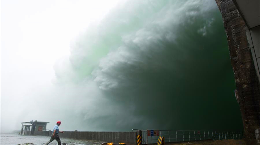 這是7月23日在安徽省阜南縣拍攝的正在關(guān)閘的淮河王家壩閘。