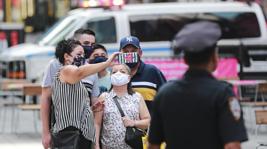 7月23日,人們戴著口罩在美國紐約時報廣場拍照留念。