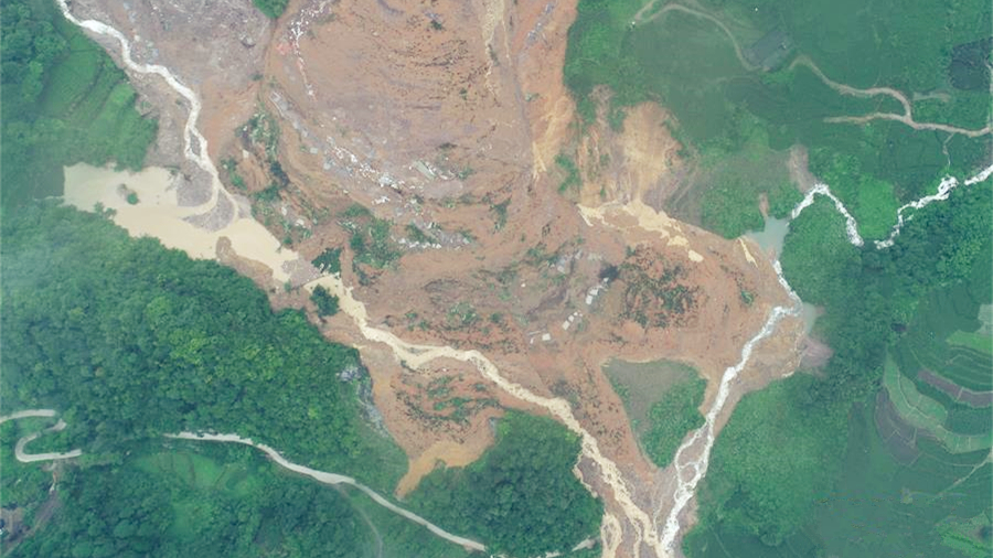 7月17日,一名地質(zhì)勘查人員在湖南省石門縣南北鎮(zhèn)潘坪村雷家山滑坡現(xiàn)場查看災(zāi)情。