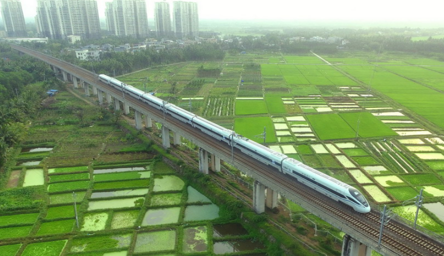 2020年3月17日,海南環(huán)島鐵路一列動車從春光明媚的瓊海城區(qū)經(jīng)過。