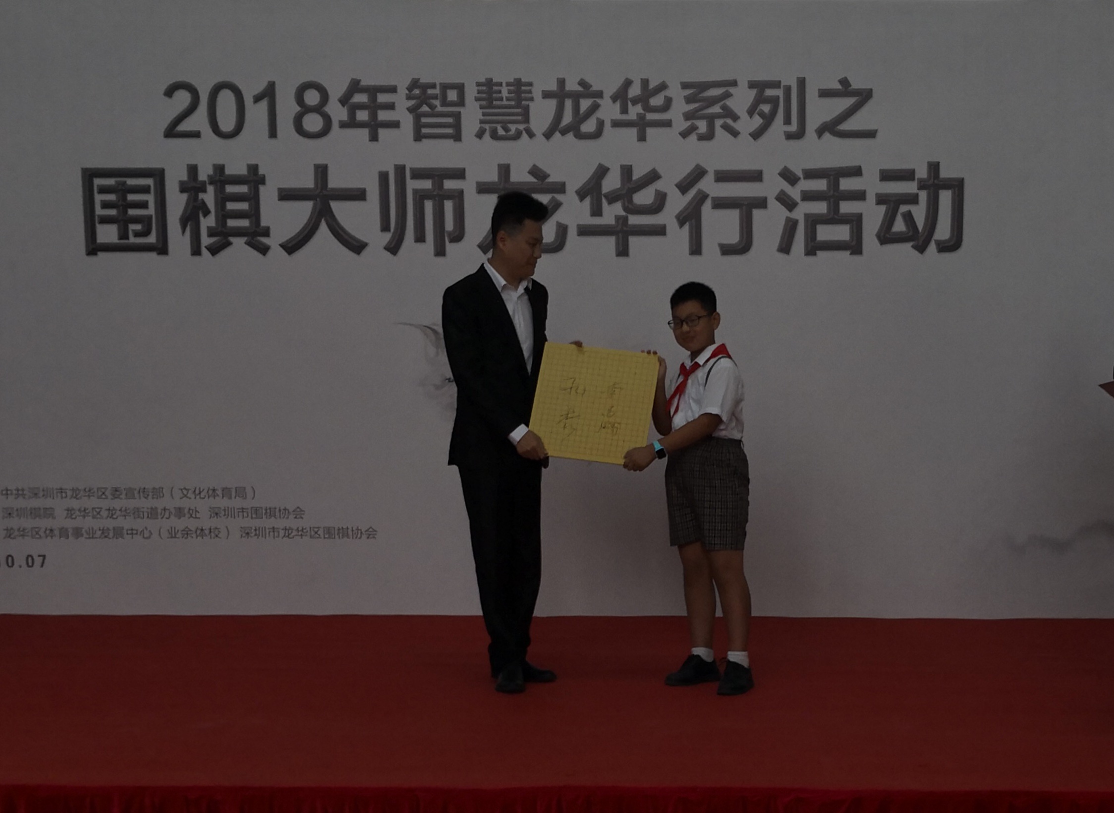 開幕式上,龍華區(qū)委副書記苗寧禮,龍華區(qū)委常委、宣傳部長黃啟鍵及區(qū)文化體育局相關(guān)負(fù)責(zé)人等在百忙中前來為“智慧龍華”捧場加油?;顒釉谳p松熱鬧的歌舞中拉開帷幕,文化體育局負(fù)責(zé)人在致辭中對諸位圍棋大師的到來表示熱烈的歡迎,對活動擴大中華圍棋文化的傳播,推動龍華區(qū)圍棋的發(fā)展給予了充分的肯定。隨后,黃啟健常委代表龍華區(qū)聘請李昌鎬大師擔(dān)任龍華區(qū)圍棋發(fā)展的名譽顧問并頒發(fā)了證書,李昌鎬則回贈了簽名棋盤。緊接著,孔杰老師也給參加活動的小棋手贈予了簽名棋盤。在廣東圍棋總冠軍佟云老師簡要介紹李昌鎬、孔杰的精采圍棋經(jīng)歷之后,活動主持人還現(xiàn)場采訪了李昌鎬、孔杰,就兩人圍棋從業(yè)過程中的難記經(jīng)歷、精采賽事以及對人工智能圍的展望等進(jìn)行了提問,兩位大師的回答坦率、誠懇,贏得了現(xiàn)場觀眾的陣陣掌聲。活動的高潮是李昌鎬、孔杰、車澤武、張亞博四位老師與龍華區(qū)的圍棋愛好者進(jìn)行多面打的活動,梁偉棠九段和徐瑩老師還進(jìn)行掛盤講解。