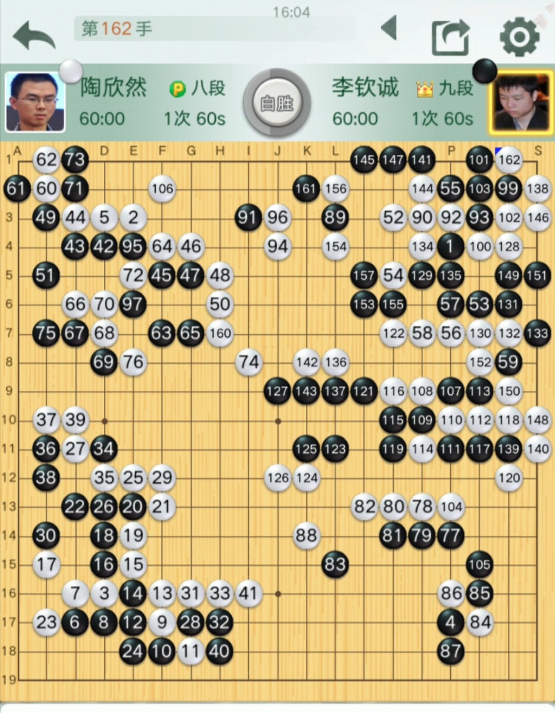第三臺李欽誠九段VS陶欣然八段(對局棋譜)。陶欣然率先鳴金,贏下一局。領(lǐng)隊梁偉棠九段對這盤棋很贊賞,認為陶欣然這盤棋下得非常漂亮,氣勢磅礴,有宇宙流再現(xiàn)的感覺。開局在左下角形成白棋取外勢,黑棋取實地的局面后,陶欣然將外勢發(fā)揮到淋漓盡致,在上面左右兩個角都繼續(xù)貫徹意圖,全力推進,形成了從上邊至中腹的巨大模樣,特別是在右下角一步五路尖沖,技驚四座,后來黑棋勉強進來中腹破空,遭到陶欣然的全部殲滅。白棋僅162手,就取得了勝利!技驚四座那步棋是78手,猶如絕藝附身。