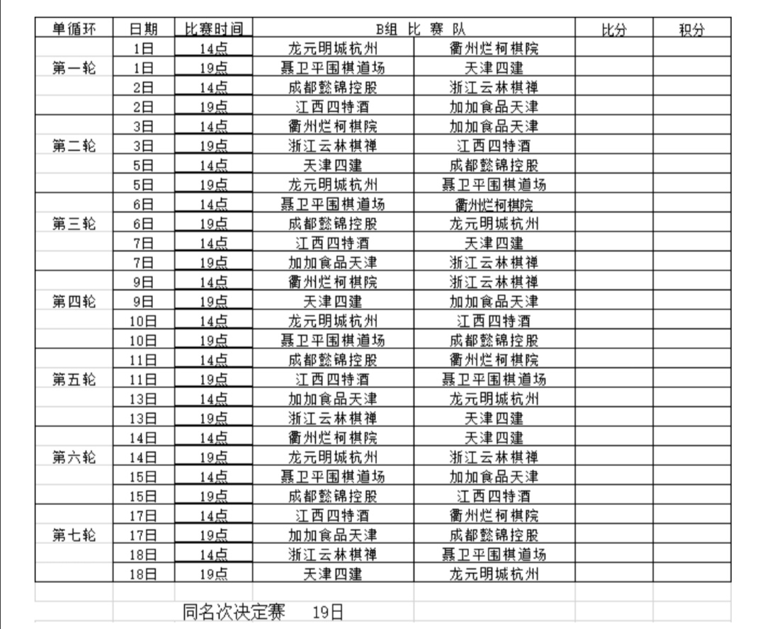 附2:2020年“華為手機杯”中國圍棋男子甲級隊聯(lián)賽網(wǎng)絡(luò)熱身賽AB兩組日程表