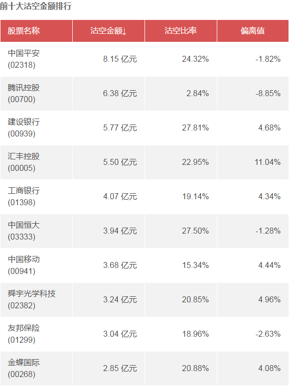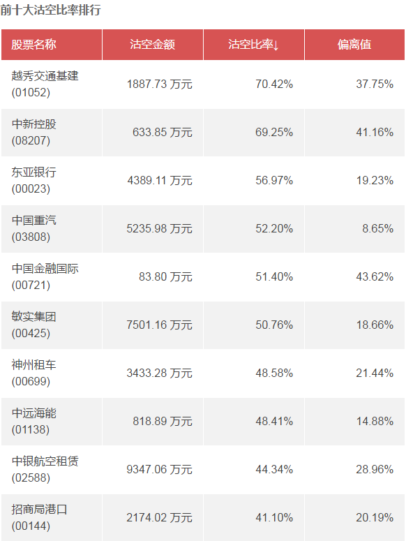 智通財經(jīng)APP數(shù)據(jù)顯示,越秀交通基建(01052)、中新控股(08207)、東亞銀行(00023)上一交易日沽空比率位于前三位,分別為70.42%、69.25%、56.97%。中國平安(02318)、騰訊控股(00700)、建設(shè)銀行(00939)的沽空金額位居前三,分別為8.15 億元、6.38 億元、5.77 億元。中國金融國際(00721)、中新控股(08207)、越秀交通基建(01052)的偏離值位居前三,分別為43.62%、41.16%、37.75%。具體情況如下: