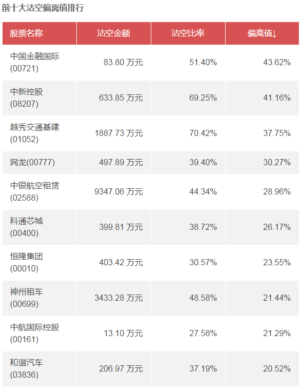 備注:以上數(shù)據(jù)由智通機器人根據(jù)港交所數(shù)據(jù),經(jīng)過人工智能運算后自動生成,并不保證數(shù)據(jù)100%準確;偏離值為當前股票的沽空比率與該股過去30天平均沽空比率的差值。