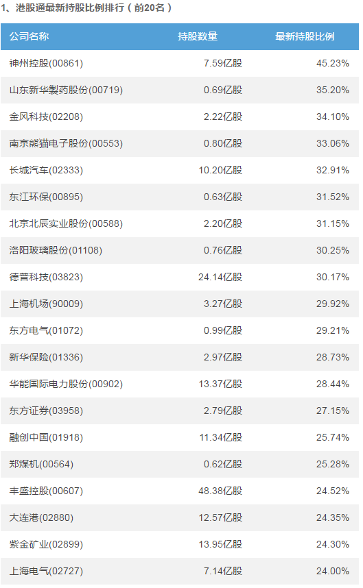 截止2018年8月16日,神州控股(00861)、山東新華製藥股份(00719)、金風(fēng)科技(02208)位居港股通持股比例前3位,分別為45.23%、35.20%、34.10%。