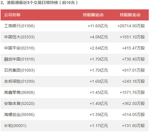 智通財(cái)經(jīng)APP獲悉,截止2018年8月16日,神州控股(00861)、山東新華製藥股份(00719)、金風(fēng)科技(02208)位居港股通持股比例前3位,分別為45.23%、35.20%、34.10%。此外,工商銀行(01398)、中國恆大(03333)、中國平安(02318)在最近5個(gè)交易日內(nèi),持股額增幅最大,分別為+11.60億元、+4.08億元、+2.84億元;騰訊控股(00700)、華潤啤酒(00291)、中國財(cái)險(xiǎn)(02328)在最近5個(gè)交易日內(nèi),持股額減幅最大,分別為-36.10億元、-3.84億元、-3.65億元。