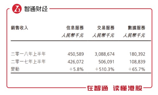 板塊方面,交易板塊是此次營收貢獻(xiàn)的主力軍,共為總營收貢獻(xiàn)81.5%的銷售收入。上半年,交易服務(wù)板塊營收入約30.9億人民幣,較去年5.06億增長約510%。信息服務(wù)板塊營收約人民幣4.5億,同比增長5.8%。數(shù)據(jù)服務(wù)板塊則貢獻(xiàn)營業(yè)收入約1.81億元人民幣,較去年1.09億增長66%。利潤率方面,信息服務(wù)增長7.12%,交易服務(wù)增長188.5%,數(shù)據(jù)服務(wù)增長23.45%。