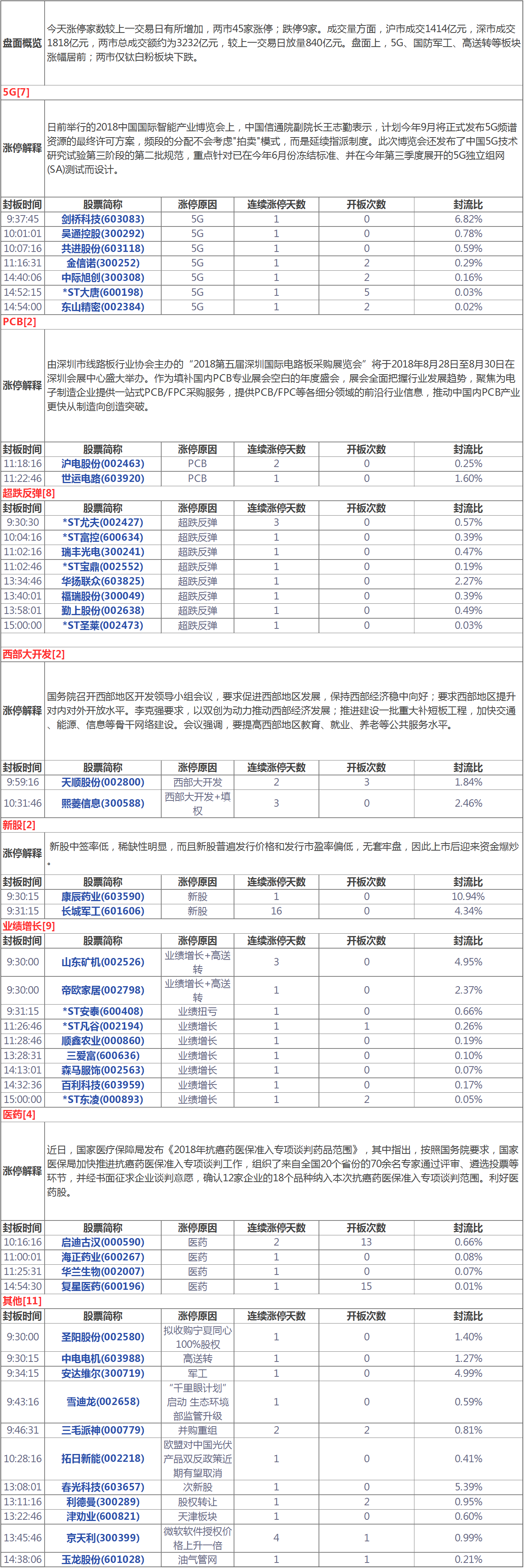 今天漲停家數較上一交易日有所增加,兩市45家漲停;跌停9家。成交量方面,滬市成交1414億元,深市成交1818億元,兩市總成交額約為3232億元,較上一交易日放量840億元。盤面上,5G、國防軍工、高送轉等板塊漲幅居前;兩市僅鈦白粉板塊下跌。