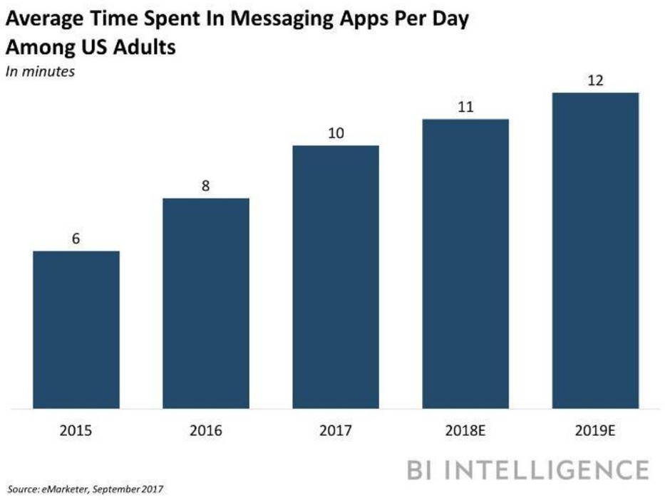 據(jù)市場研究公司eMarketer的統(tǒng)計(jì)數(shù)據(jù)顯示,去年,美國消費(fèi)者平均每天在一款通訊應(yīng)用上逗留的時(shí)間是10分鐘,較2016年的8分鐘增長了15.2%。這個(gè)平均逗留時(shí)間在今年有望增長到11分鐘,在2019年有望增長到12分鐘。