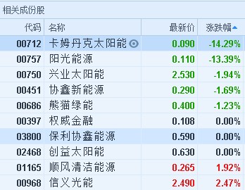 智通財(cái)經(jīng)APP獲悉,多只炒高的光伏股今日顯著回吐,截至11時53分,卡姆丹克太陽能(00712)跌14.29%,報(bào)價0.09港元,陽光能源(00757)跌13.39%,報(bào)0.11港元。