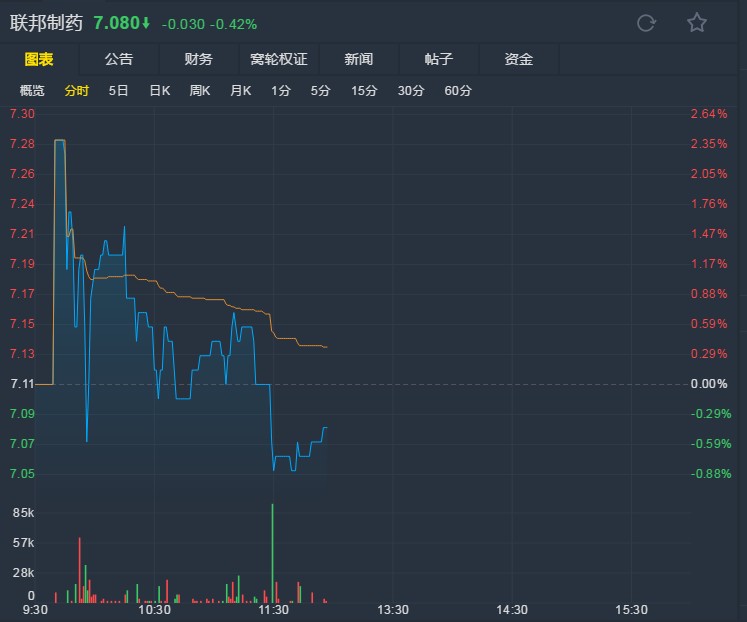 臨近上午收盤(pán),聯(lián)邦制藥報(bào)7.08港元,跌0.42%。(文文)