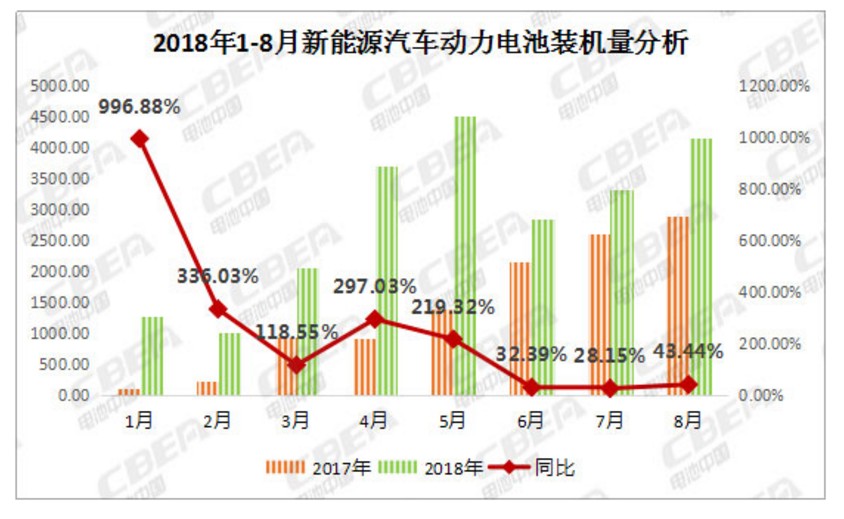 智通財經(jīng)APP獲悉,據(jù)動力電池應用分會研究部分析數(shù)據(jù)顯示,2018年8月,我國新能源汽車動力電池裝機量約4.17Gwh,環(huán)比增長25%,同比增長43.44%;1-8月累計裝機總量約22.97Gwh。