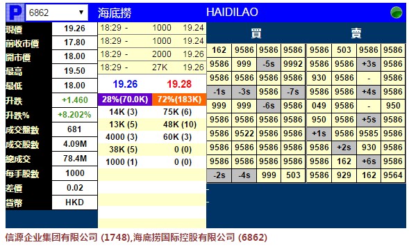 智通財(cái)經(jīng)APP獲悉,海底撈(03690)將于9月26日掛牌,上市前夕,據(jù)輝立交易場資料顯示,暗盤收?qǐng)?bào)19.26元,較招股價(jià)17.80元漲1.46元,漲8.20%。每手1000股,不計(jì)手續(xù)費(fèi),每手賺1460元。(文文)