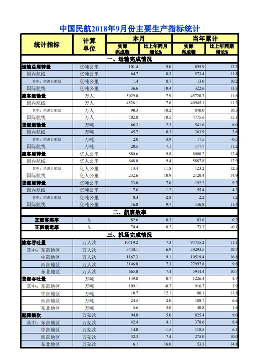智通財經(jīng)APP獲悉,中國民用航空局今日發(fā)布的主要運輸生產(chǎn)指標(biāo)統(tǒng)計顯示,今年9月,運輸總周轉(zhuǎn)量達(dá)到101.4億噸公里,同比增長9%;中國民航旅客運輸量達(dá)到5029萬人,同比增長7.9%,當(dāng)年累計運輸量已達(dá)4.57億人;9月貨郵運輸量為66.3萬噸,同比增長2.3%。