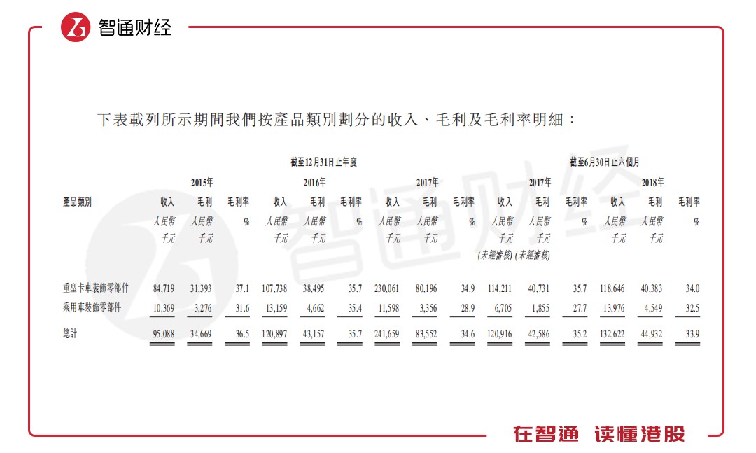 此外,天瑞在招股書中指出,就公司近期財務表現(xiàn)而言,公司的收入從截至2017年10月31日止10月的約1.97億元減至截至2018年10月31日止10個月的約1.92億元,略微減少為2.6%。然而,公司截至2018年10月31日止4個月的毛利率為35.8%,略高于上年同期的34.0%。鑒于收入減少并不明顯,以及與2018年上半年相比,公司截至2018年10月31日止4個月實現(xiàn)穩(wěn)定的毛利率及月平均毛利,因此并無跡象顯示公司的重型卡車裝飾零部件業(yè)務分部會顯著下跌。